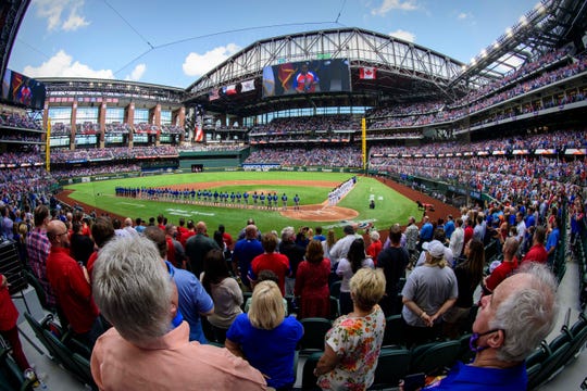 A view of the fans and the stands during the playing of the Canadian and U.S. national anthems before the game between the Texas Rangers and the Toronto Blue Jays at Globe Life Field. The Rangers opened their stadium for 100% attendance, the first such sporting event since the start of the coronavirus pandemic in March 2020. (Photo: Jerome Miron, USA TODAY Sports)